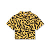 黒と黄色のタイガーの様なポロシャツ。1枚で存在感のあるシャツ、無地のカーディガンなどとのコーディネートもグッドです。同じ生地のショートパンツとセットアップができます。